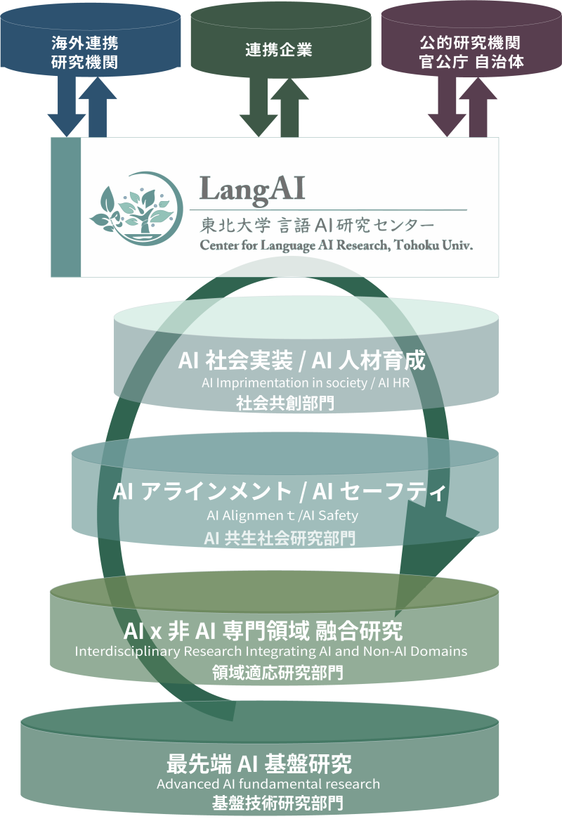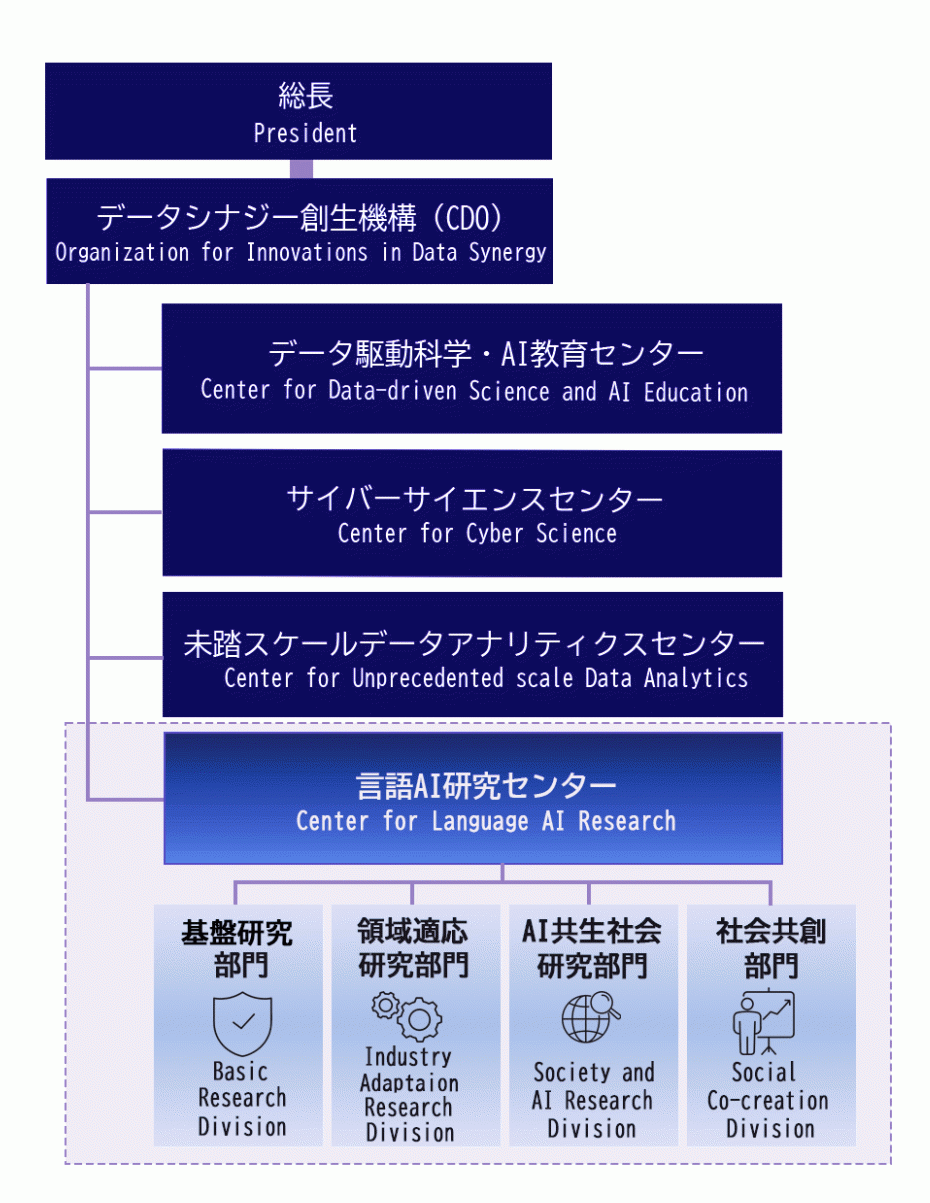 The Center for Language AI Research was established as a subordinate Organization for Innovations in Data Synergy TOHOKU University (CDO). The Center for Language AI Research has four divisions.